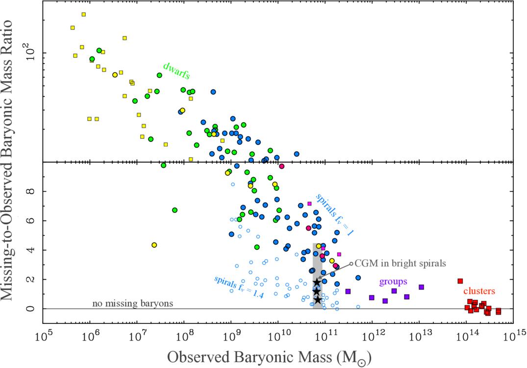 The ratio of missing-to-observed baryonic mass as a function of baryonic mass. Data and symbols are the same as in Figure 3. The ratio is linear in the bottom half of the diagram, then switches to logarithmic in the top half. Spiral galaxies of the WISE-SPARC sample are shown twice: once with fv = 1.0 (solid blue circles) and again with fv = 1.4 (small open circles). The Milky Way is the yellow point at the top of the gray band, which shows the range from zero CGM to that required to explain all of the locally missing baryons when fv = 1. Stars represent the CGM measurements of Milky Way–mass galaxies by M. J. Miller & J. N. Bregman (2015), J. N. Bregman et al. (2022), and Y. Zhang et al. (2025b) from bottom to top.
