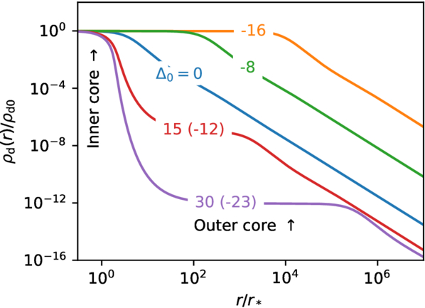 Halo density profiles normalized by the central density. Curves are labeled by the central degree of degeneracy Δ0. The double-core feature can be clearly seen for profiles with Δ0 > 0. When an outer core appears, the value of Δoc is shown in parentheses.