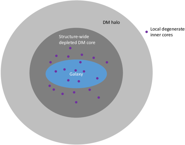 Schematic illustration of the proposed structure of a cored DM halo under the DID mechanism within the hierarchical cosmic structure formation paradigm. Compact degenerate inner cores (purple dots) form early within the smallest subhalos during hierarchical assembly. These local degeneracies deplete the surrounding DM, collectively producing a large-scale, low-density core (dark gray) embedded within the broader dark matter halo (light gray). The luminous galaxy is shown in blue.