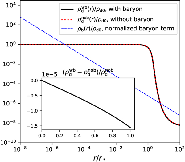 The effect of baryons in the inner core is negligible. The plot shows the normalized DM density profile for two cases: with baryons (solid curve) and without baryons (dotted curve). The normalized baryon source term is shown by the dashed curve. Since the overall density profiles near the inner core region are nearly indistinguishable, the inset plot highlights the fractional density difference between the two cases. This sample solution uses md = 5 keV, Δ0 = 20.85, rs = 1.8 kpc, and ﹩{M}_{{\rm{b}}}^{{\rm{tot}}}=1{0}^{9}\,{M}_{\odot }﹩. The velocity dispersion σv is calculated using Equation (11).
