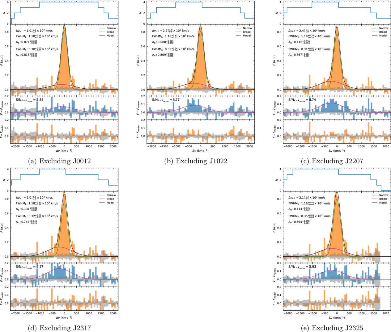 Jackknife tests of the [C II] stacked spectrum for the BAL QSO sample. Each panel shows the stack of four out of five BAL quasars, with one excluded. The broad component remains visible across all tests, but its S/N decreases when excluding J0012, indicating that the result is not solely driven by a single source.