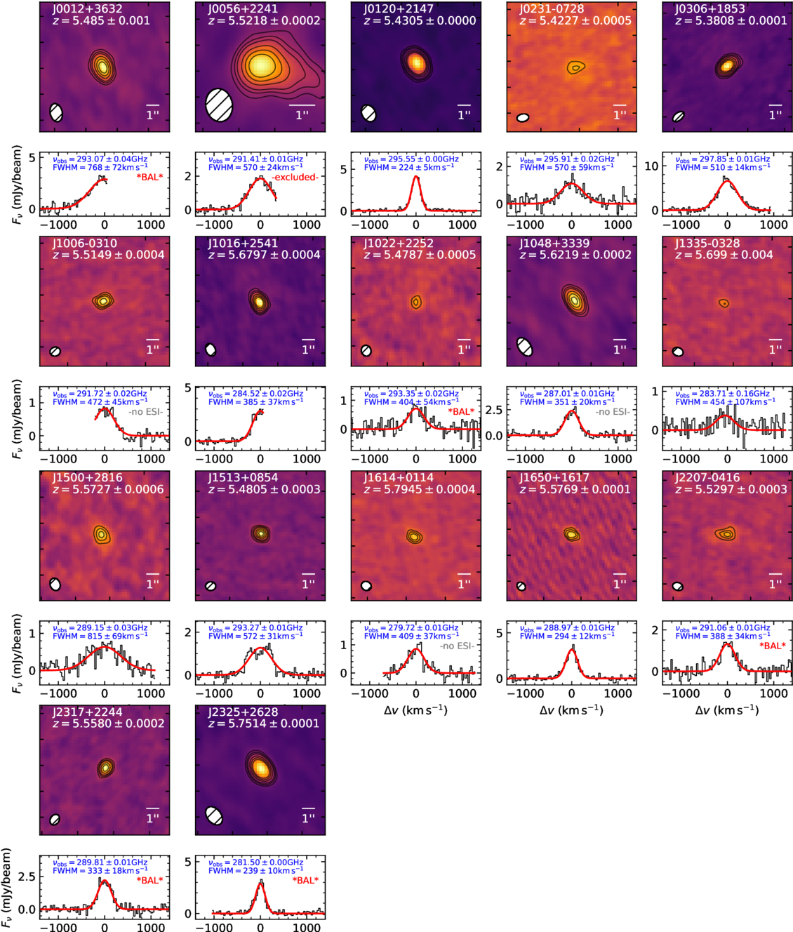 [C II] 158μm emission maps and spectra of the quasar sample observed with ALMA. Contours show (2σ, 3σ, 4σ, 6σ, 8σ, and 10σ) levels. The synthesized beam is shown in the lower-left corner of each map. Measured redshifts are labeled for each quasar, and red curves show the best Gaussian fits. Observed frequency and FWHM of the [C II] emission are also provided for reference. Quasars with significant BAL features are labeled, while those without ESI spectra are marked as “no ESI.” Since J0056 exhibits very extended [C II] emission in the image, it has been excluded from the stacking analysis.