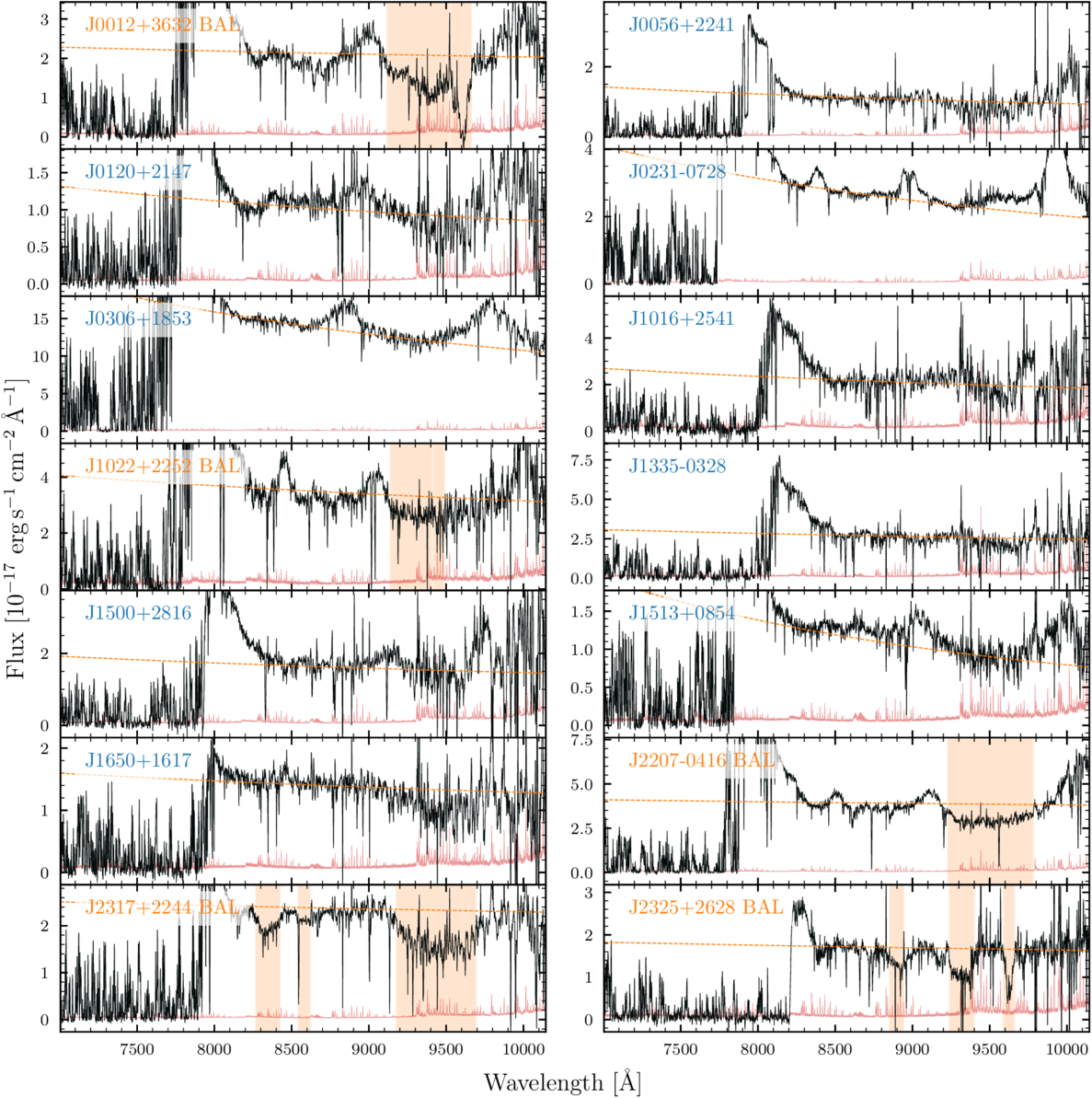 Keck/ESI rest-frame UV spectra of the quasar sample. Black and red colors plot the flux and corresponding error array, respectively. BAL quasars (BI0 > 1000 km s−1) are labeled with orange text, and regions shaded in orange highlight prominent BAL absorption troughs. The dashed curves indicate the power-law continuum fits used to normalize the spectra. The spectra are available in CSV format at doi:10.5281/zenodo.18677316.