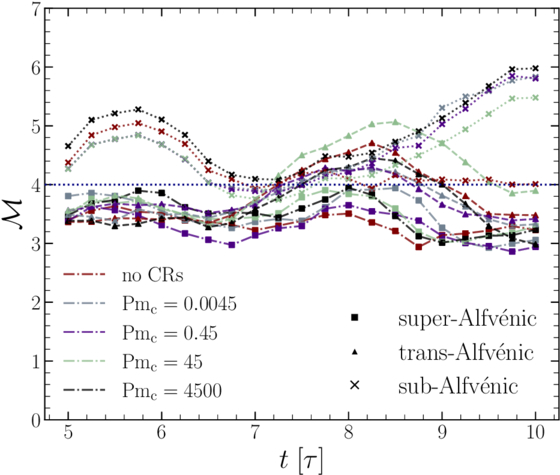 Turbulent Mach number, ﹩{ \mathcal M }﹩, plotted as a function of time, t/τ, for all simulation runs. The ﹩{ \mathcal M }﹩ values are mass-weighted and averaged over volume. The different ﹩{{ \mathcal M }}_{{\rm{A}}0}﹩ regimes are indicated by the markers, with the value of the ratio between the microphysical diffusion coefficient and the turbulence diffusion coefficient Pmcr (see Equation (15)) indicated with the color. We show results for the last 5τ of our simulation. This allows all simulations to reach a statistically stationary state (J. R. Beattie et al. 2022c) with ﹩{ \mathcal M }\approx 4﹩. All statistics in the study will be averaged over multiple realizations across the 5τ ≤ t ≤ 10τ interval shown in this plot. Note that we drive with exactly the same momentum flux injection, so there is some scatter between the simulations with different magnetic field strengths (Alfvénic state of the turbulence, shown with the marker). See Table 2 for a list all of the averaged ﹩{ \mathcal M }﹩.