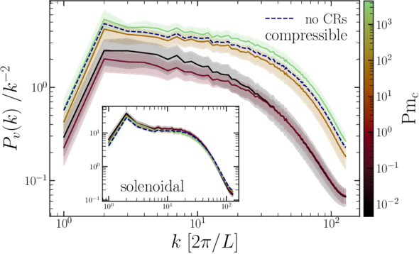 The same as in Figure 7 but for the velocity power spectra separated into compressible modes (velocity modes where ∣∇ × v∣ = 0) and solenoidal modes (velocity modes where ∣∇ · v∣ = 0). We show the compressible mode spectrum in the main panel, and the solenoidal modes are shown in the inset. The compressible mode spectrum shows a strong dichotomy between the strongly coupled (low-Pmc) and weakly coupled (high-Pmc) regimes, reducing power on all k when the CR fluid couples and becomes acoustically responsive. Unlike the compressible mode spectra, the solenoidal spectra remain invariant.
