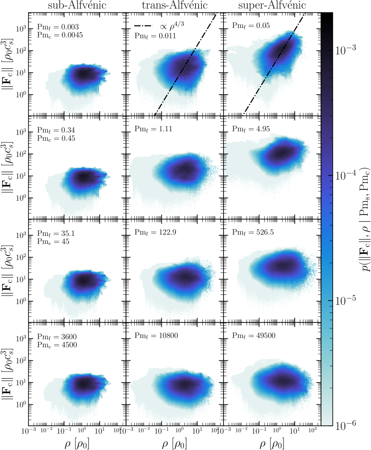 The same as Figure 5 except for the two-dimensional probability density function of the CR flux magnitude ∥Fc∥ and ρ. In the strong coupling regime (top right panels), we observe ∥Fc∥ ∝ ρ4/3 (see Equation (19)).