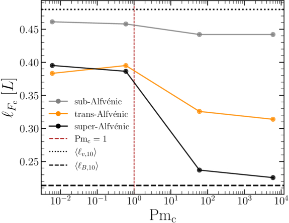 Measured correlation scales (Equation (20)) for CR flux as a function of microphysical diffusion, Pmc. We show the isotropic correlation lengths with the color indicating the ﹩{{ \mathcal M }}_{{\rm{A}}0}﹩ value of the simulation. We show a vertical line at Pmc = 1 ⇔ Dc = Dcrit and two horizontal lines indicating the mean values of ℓv and ℓB for the super-Alfvénic runs.