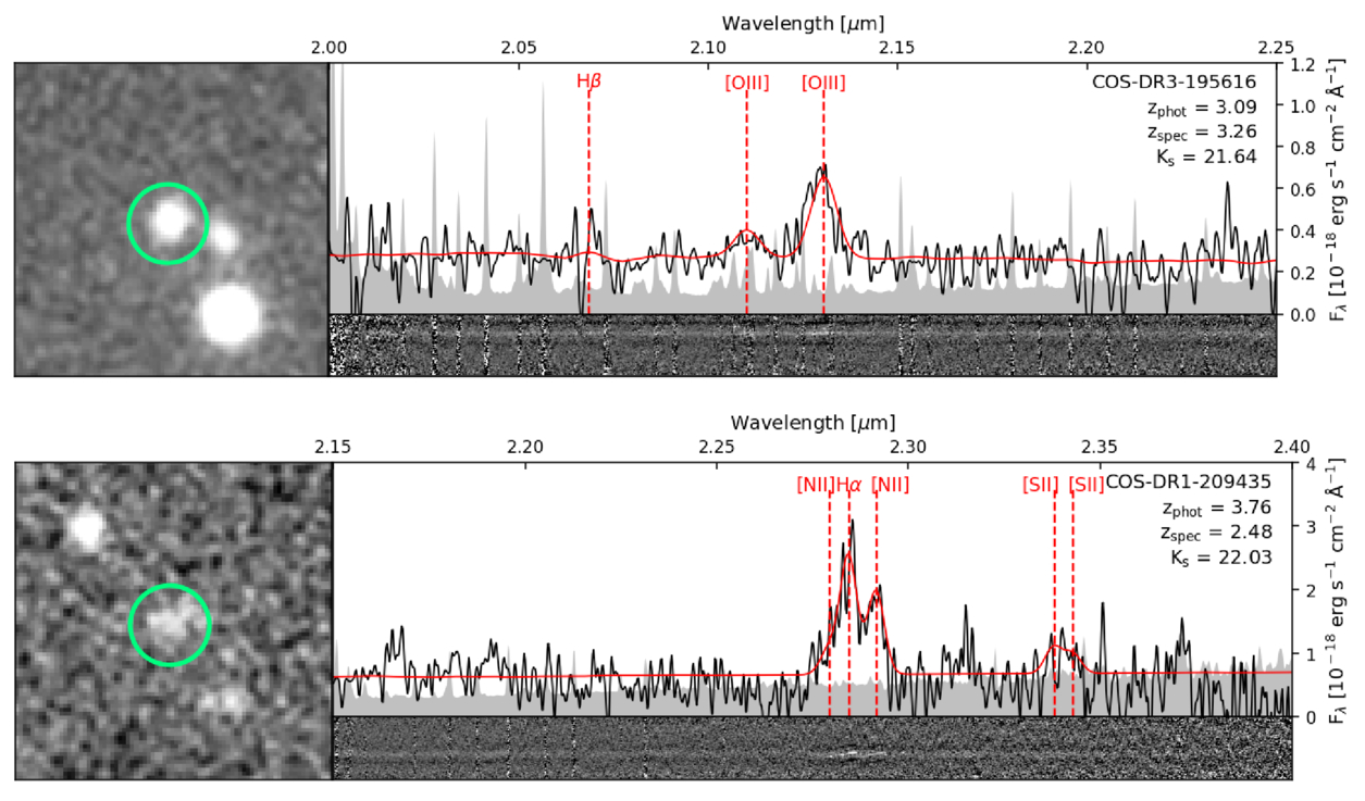 Ks-band images (left panels) and MOSFIRE 1D and 2D K-band spectra (right panels) for COS-DR3-195616 (upper) and COS-DR1-209435 (lower). The black solid lines show the observed 1D spectra. The gray shading shows the magnitude of the error spectrum. The solid red lines show the best-fit models from FAST++ described in Section 3.3. The green circles are drawn with a 2″ diameter. Red vertical dashed lines indicate the location of prominent emission lines. The y-axis shows flux density in units of 10−18 erg s−1 cm−2 Å−1, plotted from zero with a dash indicating one unit.