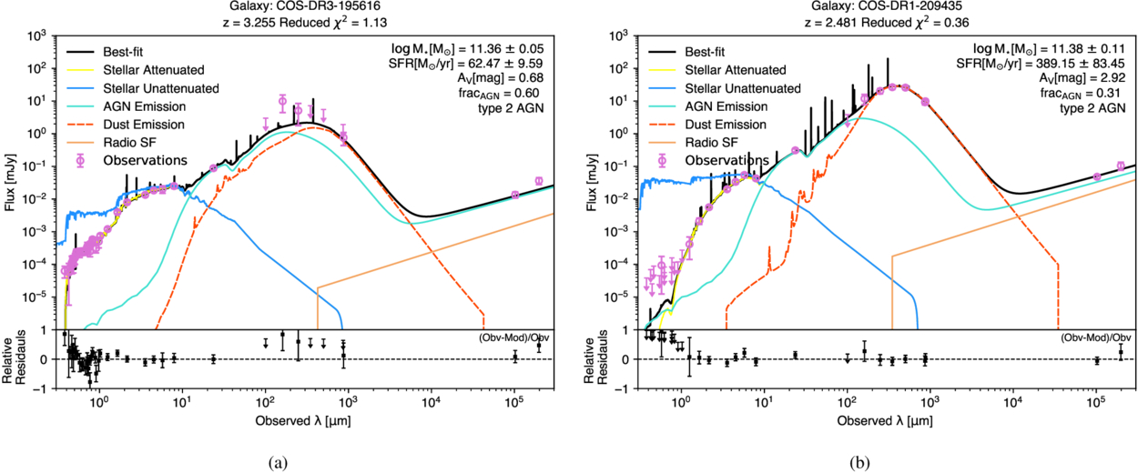 Best-fit SED (black) and residuals for COS-DR3-195616 (left panel) and COS-DR1-209435 (right panel), estimated by CIGALE from the UV-to-radio catalogs. Also shown is the unattenuated stellar (blue), dust (red), AGN (cyan), and radio synchrotron nonthermal (orange) emission. Observations are shown by purple circles, with downward arrows indicating upper limits. Estimates of physical properties are shown in the last column of Tables 2 and 3. There appears to be a significant AGN contribution in the case of both UMGs (see Section 5.1).