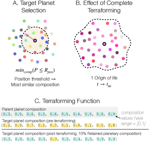 Target planet selection and terraforming. (a) The objective function, used for determining the destination of life from a terraformed “parent” planet. Candidate destinations are first constrained by a maximum positional distance threshold; among these candidates, the planet closest in composition to the parent planet is chosen as the target. (b) Simulations are initialized with one origin of life, causing the initial distribution of planet compositions (seen in panel (a)) to become correlated. (c) An example of how we determine target planet composition when retaining 10% of the pre-terraformed planet composition. Note that while our simulations use a 3D space, the concept figure shows only a 2D space for clarity.