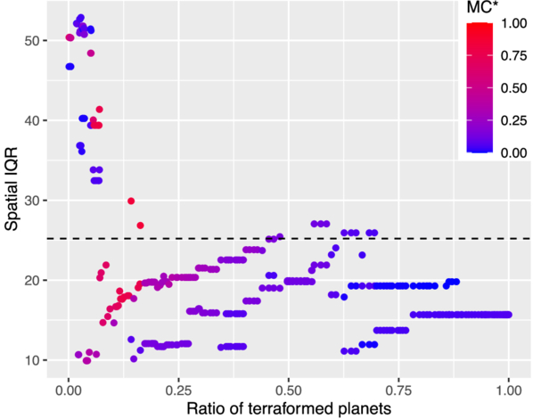 Selection criteria used on clusters of planets. Spatial localization of clusters of planets is shown on the y-axis, as measured by the IQR of each cluster. The horizontal dashed line (at IQR = 25.2) denotes the threshold used, below which we selected clusters for being spatially localized. This corresponds to approximately the average IQR of planets in a cube the size of 1/8 the model space. Color bar shows the MC of clusters, with a high MC indicating a cluster as being important for raising the full space’s Mantel coefficient.