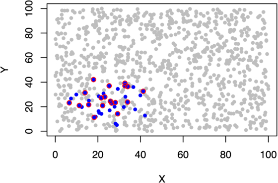 The earliest detected cluster in our simulation, at a terraformed ratio of 0.04. This is a projection of 3D planet locations in the 2D X–Y plane, and the earliest time step where we detect a cluster of planets meeting our selection criteria. True terraformed planets (n = 40) have blue fill, while planets detected by our selection method (n = 19) have a red outline.