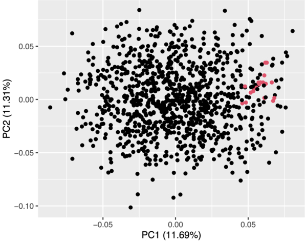 PCA of planetary compositions at a terraformed ratio of 0.04, the earliest time step where we detect selected clusters (red). PCA is used here only for displaying 10 compositional dimensions on a 2D page and was not used for clustering.