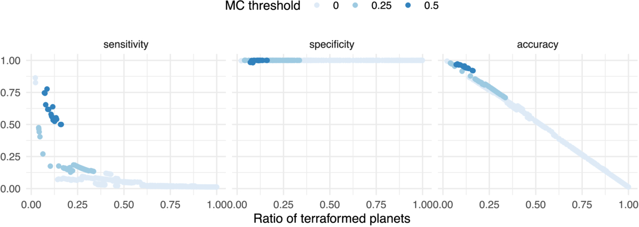 Summary evaluation metrics of sensitivity, specificity, and accuracy for our selected clusters, as a function of terraformed ratio. The color gradient corresponds to subsets of the data meeting MC selection thresholds of 0, 0.25, and 0.5.