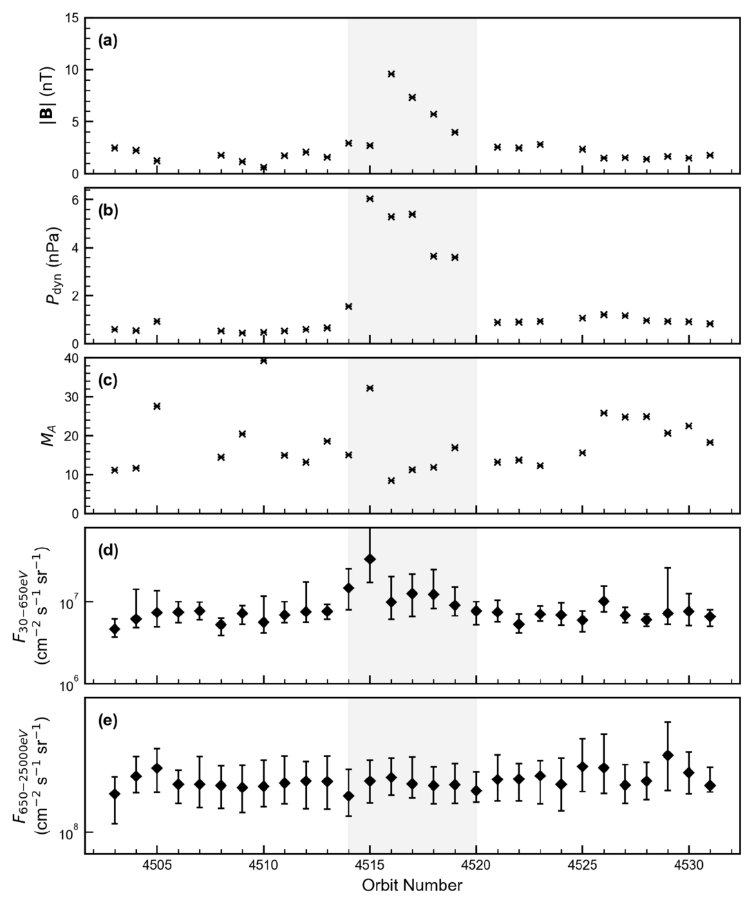 Orbit-by-orbit variations of solar wind parameters and ion precipitation fluxes for CIR Case 2. The horizontal axis denotes the MAVEN orbit number. From top to bottom, the subplots display (a) the magnetic field strength, (b) solar wind dynamic pressure, (c) Alfvén Mach number, (d) low-energy ion precipitation flux (30–650 eV), and (e) high-energy ion precipitation flux (650–25,000 eV). The shaded region marks the event period.