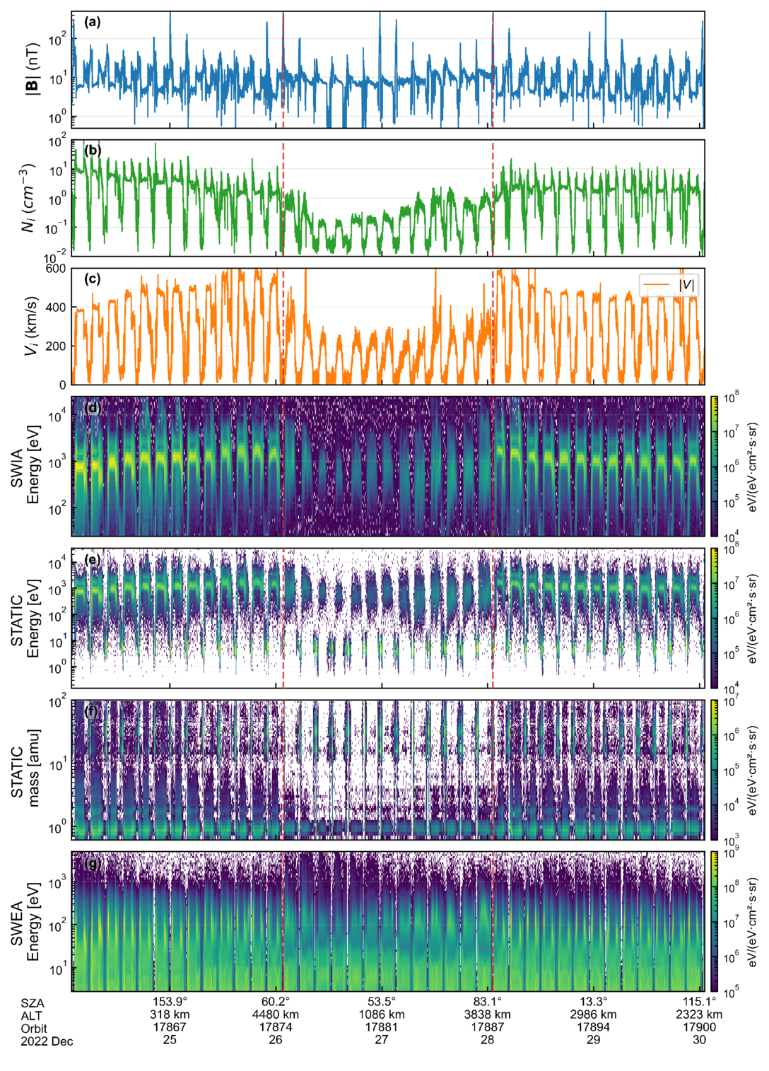 Overview of the DSW event. From top to bottom, the subpanels show (a) the magnetic field magnitude measured by MAG, (b) the ion density derived from SWIA, (c) the ion bulk velocity from SWIA, (d) the SWIA omnidirectional ion energy spectrum, (e) the STATIC ion energy spectrum, (f) the STATIC mass spectrogram, and (g) the SWEA electron energy spectrum. The event interval is marked by a vertical red dashed line.