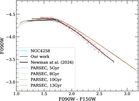 Color relations for high photometry quality galaxies. The M. J. B. Newman et al. (2024a) calibration blueward of (F090W − F150W)0 = 1.7 is shown in the thick black line. Theoretical PARSEC expectations redward of (F090W − F150W)0 = 1.3 are shown by dotted lines.