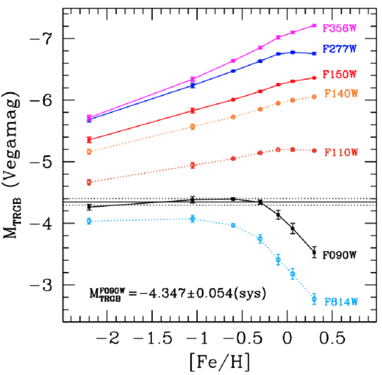 Teramo SPoT model TRGB magnitudes as a function of metallicity for selected JWST and HST filters. The horizontal black line illustrates the F090W calibration from G. S. Anand et al. (2024a) with 1σ uncertainties shown with dotted lines.