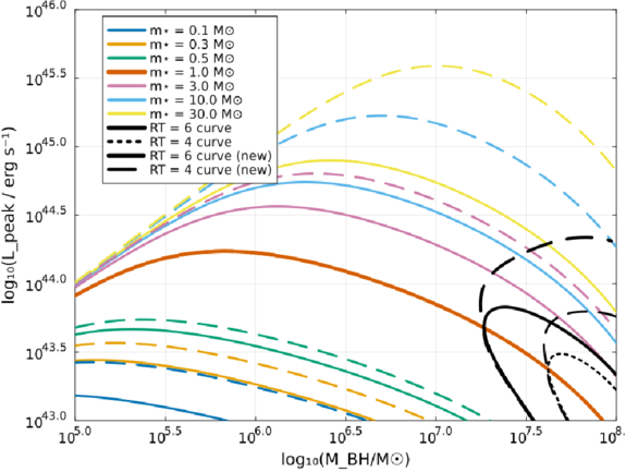 Luminosities of full disruptions with stellar masses M* = 0.1, 0.3, 0.5, 1, 3, 10, 30 M⊙ as functions of MBH. Solid lines are calculated using the single power-law mass–radius relation, and dashed lines are calculated from the modified one. Also shown are the curves of luminosity our model would predict for RT = 6rg and RT = 4rg; extreme TDEs occur when 4rg < rp < 6rg (T. Ryu et al. 2023a); direct capture ensues when rp < 4rg (an exact result for Schwarzschild spacetime, the angle-averaged result for Kerr; J. Krolik et al. 2020). The luminosities of partial disruptions of a given M* form a family lying below the curve for a full disruption of such a star.