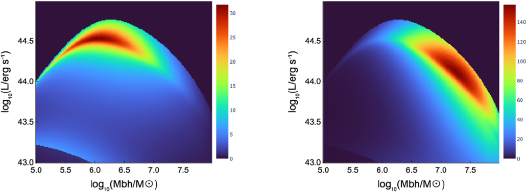 The total (full + partial) event rate density in the ﹩\mathrm{log}{M}_{{\rm{BH}}}\times \mathrm{log}{L}_{{\rm{peak}}}﹩ plane for flux-limited samples. Both panels assume that the stellar mass function is proportional to a Salpeter IMF, but in the left panel αBH = −0.5 and in the right panel αBH = +0.5. Rates (in arbitrary units) are shown on a linear scale calibrated by the color bar.