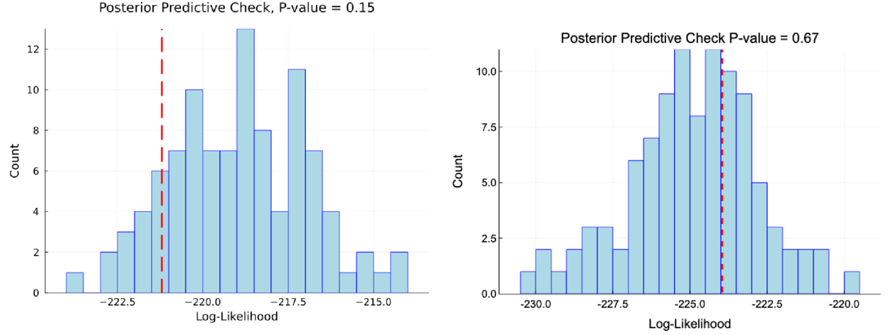 The distribution of likelihoods for the best-fit parameters derived from 100 synthetic datasets constructed in the p-value procedure (blue histogram) compared to the likelihood of the actual data’s best-fit parameters (red vertical line), for the single power-law mass–radius relation (left) and the modified mass–radius relation (right). The likelihood of the observed data is better than the likelihood obtained in 15% of the synthetic datasets for the single power-law model and is better than obtained in 67% of the synthetic datasets for the modified mass–radius relation.