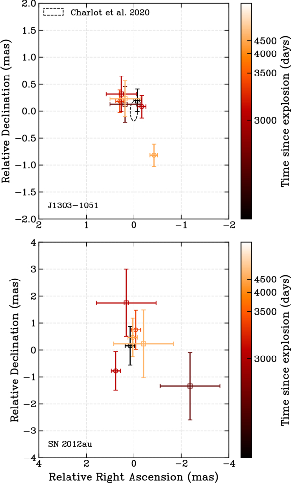 Offsets along the R.A. and decl. axis relative to J2000 ﹩(\alpha ,\delta )=(1{3}^{{\rm{h}}}0{3}^{{\rm{m}}}13\mathop{.}\limits^{{\rm{s}}}867940(53),-10^\circ 5{1}^{{\prime} }17\mathop{.}\limits^{^{\prime\prime} }12905(18))﹩ for J1303−1051 (top panel) and ﹩(\alpha ,\delta )=(1{2}^{{\rm{h}}}5{4}^{{\rm{m}}}52\mathop{.}\limits^{{\rm{s}}}25525,-10^\circ 1{4}^{{\prime} }50\mathop{.}\limits^{^{\prime\prime} }634)﹩ for SN 2012au (bottom panel). We plot the total uncertainties, which include both statistical and systematic contributions induced by phase referencing to the phase calibrator, J1305−1033 (L. Y. Petrov & Y. Y. Kovalev 2025). In the top panel, we overplot the 1σ-localization contour of the check source J1303−1051 from P. Charlot et al. (2020), highlighting consistency in our repeated phase-referenced measurements. The one observation inconsistent with the remaining observations of J1303–1051 was omitted when measuring the proper motion of SN 2012au. Measurements performed at the K band (22 and 24 GHz) are indicated as squares, and those at the C-band (5 GHz) as circles. The color scale of each data point is scaled relative to the original explosion date.
