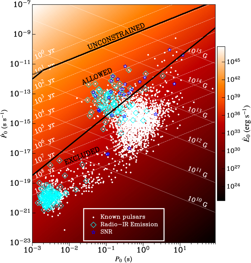 Constraints on the formation properties of the candidate NS at the center of SN 2012au, assuming the late-time radio emission is a PWN powered by spindown via magnetic dipole radiation. The initial period (horizontal axis) and period derivative (vertical axis) are used to construct the initial spindown luminosity scales (heatmap). We overplot lines of constant dipole magnetic field strength and initial spindown timescale as dotted and dashed–dotted white lines, respectively. Allowable combinations of ﹩{P}_{0},{\dot{P}}_{0}﹩, and B for SN 2012au are bounded by the central polygon. The region is bounded above by the requirement that the nebula must be contained to RPWN ≤ 1.4 × 1017 cm at t = 2925 days post-collapse (as constrained by our VLBI images). The region is bounded below by the requirement that the radio luminosity cannot be higher than the pulsar spindown luminosity. The region where no analytic constraint on the NS’s formation properties can be established (e.g., where τ0 ≲ 8 yr, where τ0 is the typical spindown timescale) is indicated by the “unconstrained” region. We overplot present-day combinations of a large sample of known pulsars, including magnetars and recycled millisecond pulsars, for comparison (R. N. Manchester et al. 2005; M. Pitkin 2018). The allowable parameter space includes a number of present-day systems associated with an SNR or radio-IR continuum emission, indicated by blue stars/cyan diamonds, respectively.