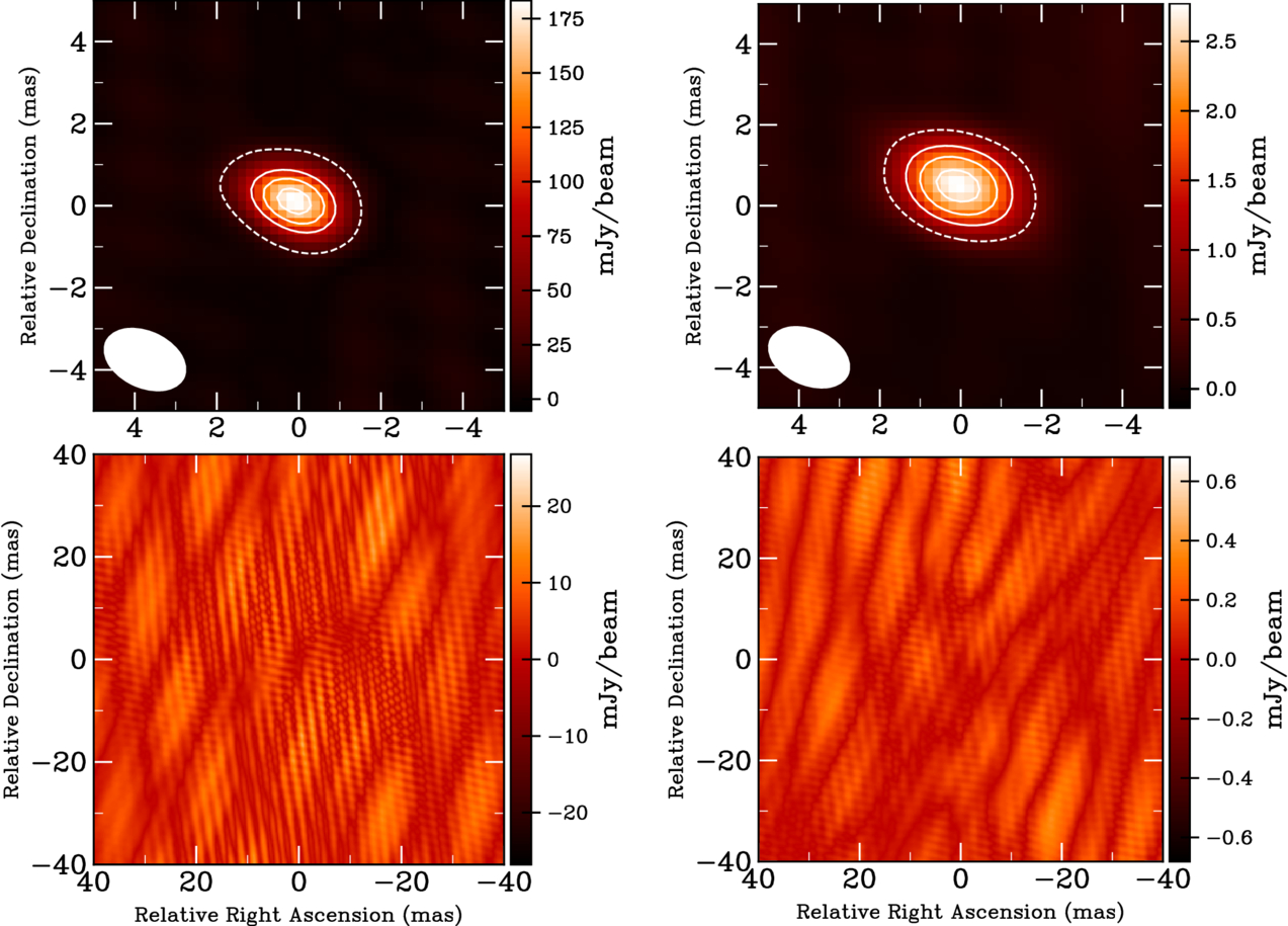 Images of J1303−1051 (left panels) and SN 2012au (right panels), showing the final clean images (top row) and residuals (bottom row) after combining epochs 1, 4, and 5 at 4.93 GHz. The 5σ contour is dashed; solid contours are at 50%, 70%, and 90% of the peak. The color scale is in mJy beam−1, and the synthesized beam is shown in the lower-left of each clean image. Residuals are saturated to ±5σ to highlight systematic calibration errors common to both datasets.