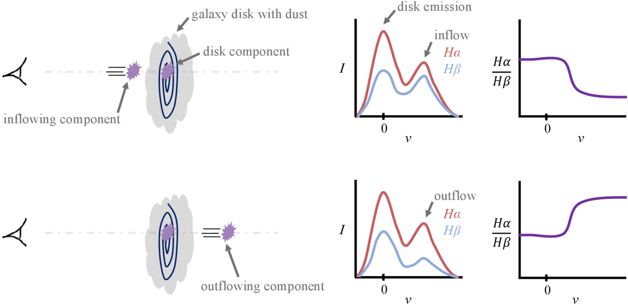 An exaggerated schematic displaying the degeneracy in emission spectra of galaxies. In the top panel, an inflowing component in front of the galaxy appears as a component redshifted from the disk component in the spectrum. In the bottom panel, an outflowing component behind the galaxy similarly appears as a redshifted component. Though the Hα emission is similar, the Hβ emission will be more affected by extinction due to dust in the galaxy. Therefore, the Balmer decrement will reveal which component is inflowing and which is outflowing.