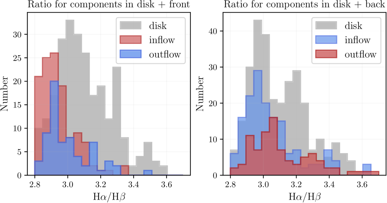Left: the distribution of Balmer ratios between different components in the ISM and front of the galaxy. Red denotes inflow (redshifted components in front of the galaxy) and blue denotes outflow. Both inflow and outflow peak at lower ratios than the disk. Right: a histogram showing the ratios of different components in the ISM and behind the galaxy. In this case, blue represents inflow (blueshifted components behind the galaxy), and red represents outflow. Inflow peaks at a similar ratio to the disk, while outflow peaks at a ratio higher than the disk.