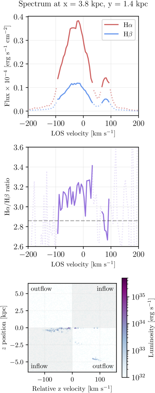 Top: Hα and Hβ spectra of a single sightline ∼3.1 kpc from the center of the galaxy in the earliest time step. Dotted lines are regions below the flux limit, which were left out of the analysis, while solid lines are areas above the flux limit. Center: the Balmer decrement across the spectrum, with dotted lines again representing areas excluded from remaining analysis. The dashed gray line indicates the intrinsic Balmer decrement assuming Case B recombination and no dust. Bottom: a 2D histogram of the positions and velocities of particles in the sightline, weighted by luminosity. The displayed velocities are relative to the observer (not relative to the galaxy), so the sign of the velocity matches the spectra above.