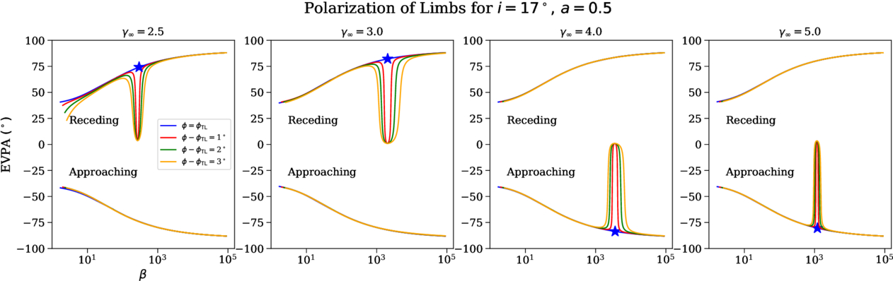 Polarization angle of the limb, plotted for multiple different values of γ∞ and ϕ. The angles are measured relative to the TL ϕTL, which denotes the genuine projected edge of the jet. The blue stars denote the prediction of Equation (49) for the location of ﹩{\tilde{R}}_{{\rm{limb}}}﹩ and hence ﹩{\tilde{\beta }}_{{\rm{limb}}}﹩ (the point at which fR = 0). For i = 17°, we have csci ≈ 3.42, which is why the swing switches from the receding edge to the boosted edge after the second panel.