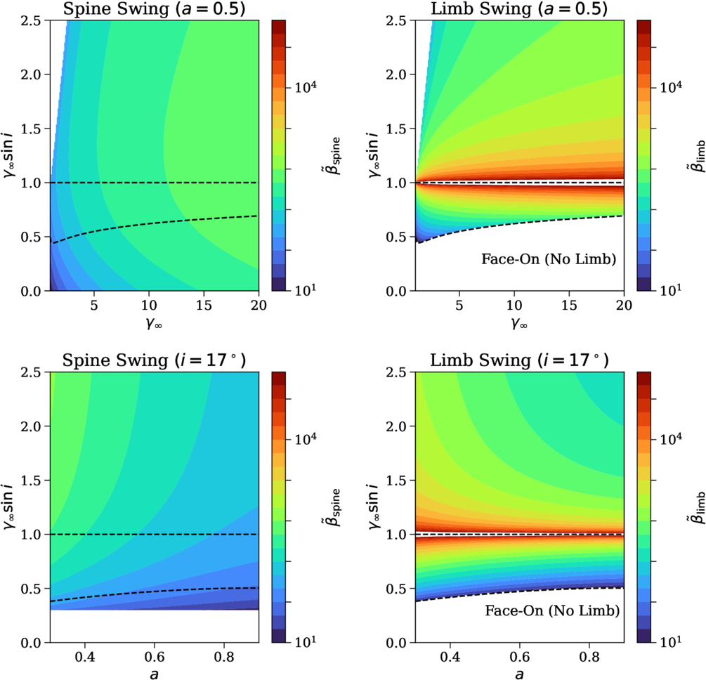 Image coordinate of polarization swing along the spine (left column) and along the relevant limb (right column). For the top row, the black hole spin is fixed, and ﹩\tilde{\beta }﹩ (in units of M) is plotted as a function of γ∞ and ﹩{\gamma }_{\infty }\sin i﹩. For the bottom row, inclination is fixed, and ﹩\tilde{\beta }﹩ is plotted as a function of black hole spin and ﹩{\gamma }_{\infty }\sin i﹩. Note that ﹩{\tilde{\beta }}_{{\rm{limb}}}﹩ diverges when ﹩{\gamma }_{\infty }\sin i=1﹩, which is demarcated with the upper black dashed line. The lower black dashed line marks the transition into the face-on regime, where the emission is viewed from within the cone of the jet and the projected limbs disappear from the image.