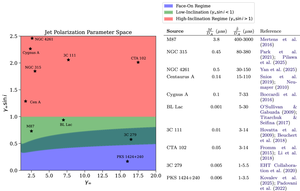 On the left, we plot the three inclination regimes used to describe the polarization of jets. The red region corresponds to the high-inclination regime with ﹩{\gamma }_{\infty }\sin i\gt 1﹩, the green region corresponds to the low-inclination regime with ﹩{\gamma }_{\infty }\sin i\lt 1﹩, and the blue region corresponds to the face-on regime with i < θswing. While the red and green regions are separated by the simple curve ﹩{\gamma }_{\infty }\sin i=1﹩, the separation between the green and blue curves depends more sensitively on the model parameters, thus creating the overlap region. Included in this plot are various sources with bright jets and known Lorentz factors and inclinations. On the right, we then list the predicted ﹩\tilde{\beta }﹩ for each source, assuming a range of spin a = 0.3–0.9. For all sources, ﹩\tilde{\beta }﹩ corresponds to the limb swing, except for 3C 279 and PKS 1424+240, for which ﹩\tilde{\beta }﹩ corresponds to the spine swing. Note that the error bars on the measured values of γ∞ are often large but are not shown here.