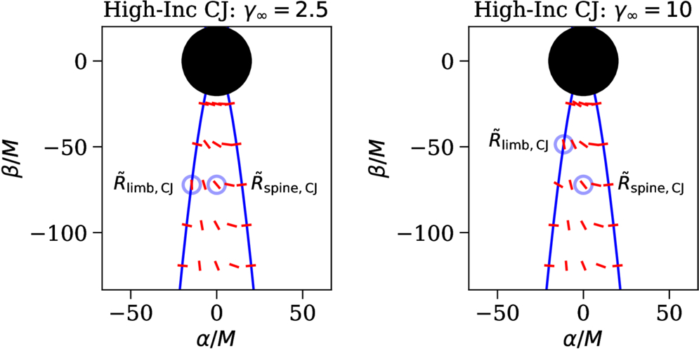 Semianalytic EVPA maps of the high-inclination (i = 70°, ψ = 0.15) counterjet. For both Lorentz factors shown, a spin-dependent swing emerges along the spine of the counterjet and the approaching limb of the counterjet. In both cases, the dependence of this swing on both Lorentz factor and transverse location is significantly weaker than that of the forward jet (see Equation (60)).