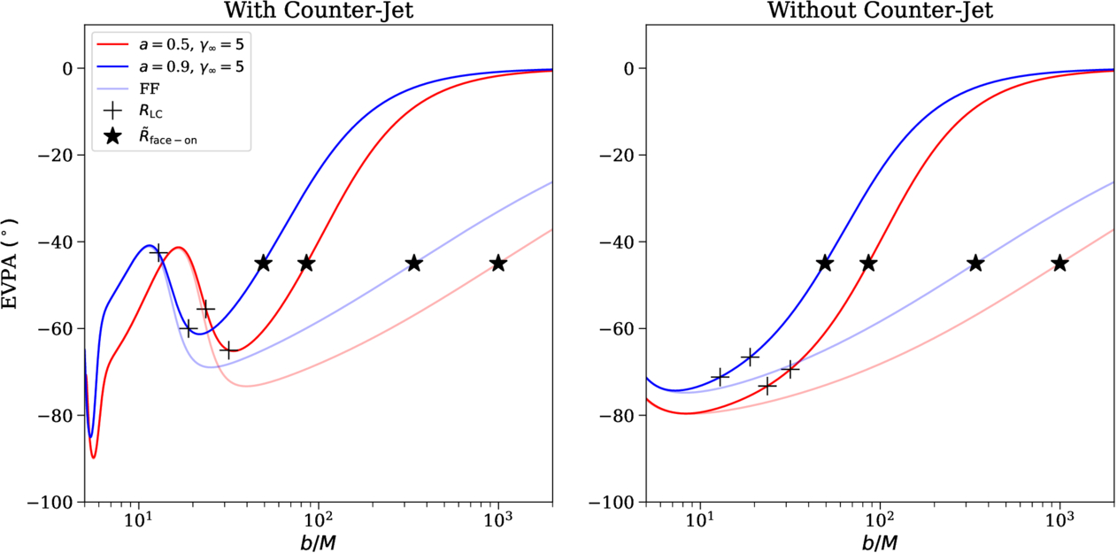 EVPA of a face-on jet, again including fully general relativistic effects. On the left, the results are shown when a counterjet is present (thus matching Figure 2), and on the right, the results are shown when a counterjet is not present. In each panel, polarization curves are plotted for two different spins (a = 0.5 and a = 0.9) and terminal Lorentz factors (γ∞ = 5 and force free). When a counterjet is present, the polarization curve always shows a sharp swing at the light cylinder (marked with black crosses), regardless of the terminal Lorentz factor. But when the counterjet is not present, the polarization angle swings more modestly at the true light cylinder, meaning that ﹩\tilde{R}﹩ (shown as a star) can serve as a more easily identifiable metric.