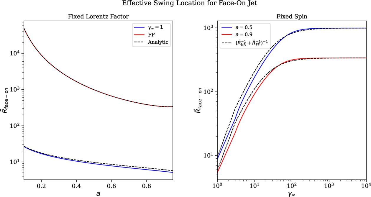 Effective EVPA swing location ﹩({\tilde{R}}_{{\rm{face}}-{\rm{on}}})﹩ as a function of both spin (left panel) and terminal Lorentz factor (right panel) for a sample jet. Analytic solutions exist in the nonrelativistic (γ∞ ∼ 1) regime and the force-free (γ∞ ≫ 1) regime, which are shown as blacked dashed lines in the left panel. These two analytic solutions can then be stitched together using Equation (24), which is overplotted as black dashed lines in the right panel. In all cases, ﹩{\tilde{R}}_{{\rm{face}}-{\rm{on}}}﹩ depends strongly on black hole spin and γ∞.