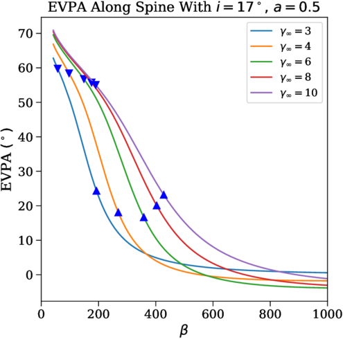 Net spine polarization angle as a function of γ∞. Increasing γ∞ generically makes the location of the polarization swing move farther out. As with Figure 6, each curve has two markers in blue: face-up triangles denoting the prediction (Equation (34)) for the effective swing location along the background emission, and face-down triangles denoting the prediction for the effective swing location along the foreground emission. The location where the net EVPA = 45° lies roughly between these two estimates of the swing location.