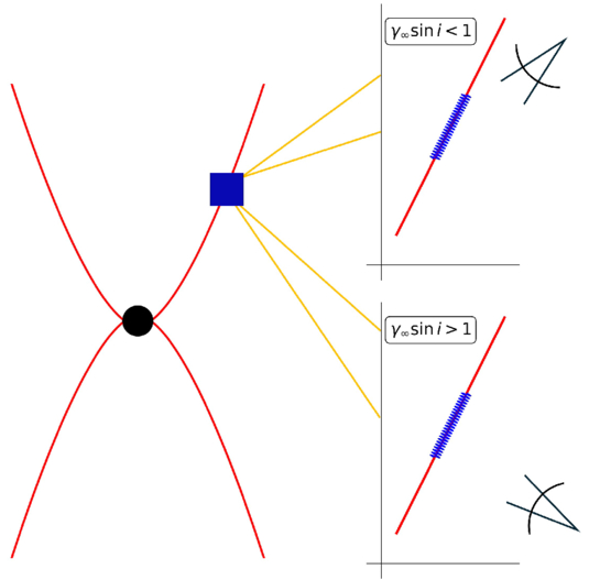 Boosting into the local frame of a fluid parcel (shown as a square, with magnetic field line in red and electron gyromotion in blue). In this fluid frame, the orientation of the observer’s line of sight depends on the magnitude of ﹩{\gamma }_{\infty }\sin i﹩. If ﹩{\gamma }_{\infty }\sin i\gt 1﹩, then the observer lies above the emitting material. If ﹩{\gamma }_{\infty }\sin i\lt 1﹩, then the observer lies below the emitting material. This geometric flip causes the polarization pattern to reflect across the image when ﹩{\gamma }_{\infty }\sin i﹩ crosses one, as shown in Figures 11 and 15.
