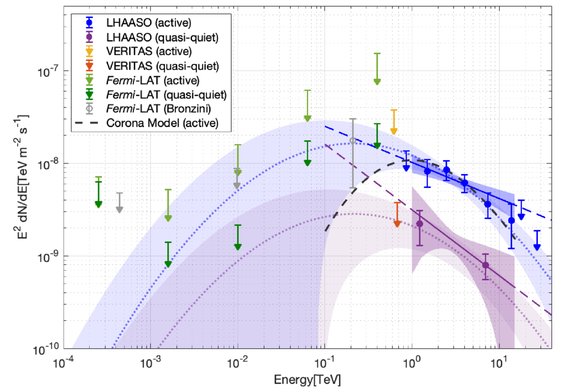 NGC 4278 SED during the active and quasi-quiet periods: LHAASO-WCDA fluxes and upper limits from LHAASO-KM2A (blue and purple), VERITAS (yellow and orange), and Fermi-LAT (green and light green). The E. Bronzini et al. (2024) Fermi-LAT (gray) is from data spanning the 1LHAASO Catalog dates. The power-law fit to the LHAASO data is from Z. Cao et al. (2024b). A log-parabolic model was fit to the combined dataset for the active period (blue dotted line), to explore the curvature of the spectrum. During the quasi-quiet period (purple dotted line), the two LHAASO-WCDA flux points do not constrain the curvature, so only the normalization was fit assuming the same spectral shape as the active period. The example corona model presented in Section 6.1 is also included.