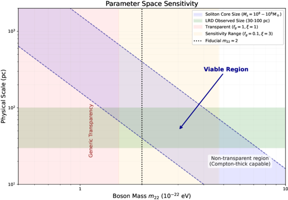 Constraints on boson mass (m22) from combining the soliton size scaling (Equation (1)) with an opacity (column) requirement. The vertical axis shows a characteristic physical scale; we compare the observed effective radius range of LRDs (green band, re ∼ 30–100 pc) with the soliton core radius predicted for Ms = 108–109 M⊙ (blue band; dashed boundaries follow ﹩{r}_{c}\propto {m}_{22}^{-2}﹩). The red region marks parameters for which even a maximally loaded core (fg ≈ 1) confined within re ≈ rc with ξ ≈ 1 cannot reach NH ≈ 1024 cm−2,. The opacity boundary is evaluated for a representative Ms ∼ 109 M⊙ (typical of LRD hosts). The orange shaded area illustrates sensitivity to baryon loading uncertainties by adopting conservative values (fg = 0.1, ξ = 3). The viable region is the overlap between the observed size band and the nontransparent (Compton-thick-capable) region; the region outside the red shaded area corresponds entirely to the nontransparent (Compton-thick capable) regime. The “viable region” is specifically the parallelogram defined by the overlap between the observed size band and this nontransparent regime. Under the direct-mapping assumption (re ∼ rc), this favors m22 ∼ few, and we adopt m22 = 2 as a fiducial baseline for subsequent figures.