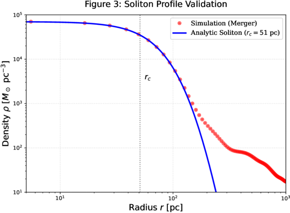 Validation of a compact soliton core in an idealized merger. Radial density profile of the simulated core (red points) compared to the analytic soliton solution (blue line; fitted rc = 2.32 in code units). Both axes are shown in code units; the corresponding physical scaling for m22 = 2 is given in Section 4 (yielding rc ≃ 51 pc and Mc ≃ 7.8 × 108 M⊙). The deviation at large radii reflects unrelaxed merger debris and finite-box/periodic-boundary effects and does not affect the inner soliton core relevant for our analytic estimates.