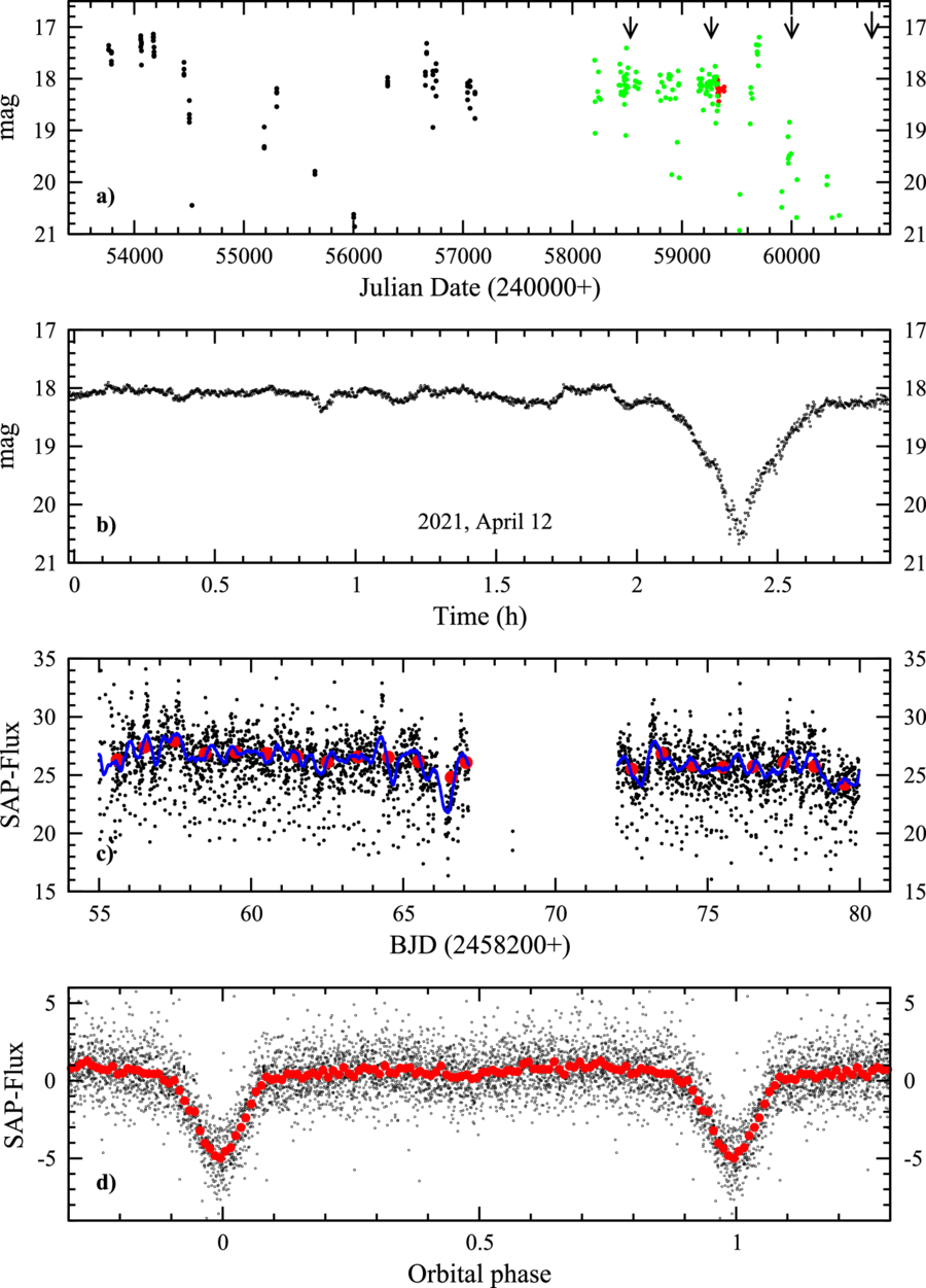 (a) Long-term light curve of CRTS 0934. Black and green dots are CRTS and ZTF data, respectively. The red dots represent the nightly average out-of-eclipse magnitude of the OPD observations. The black arrows indicate mid-epochs of the TESS data. (b) Time-resolved OPD light curve of 2021, April 12 (starting just before midnight of April 11). (c) Sector 35 TESS light curve. The red dots are average flux values (after masking eclipses) within 1 day intervals. The light curves smoothed with a Savitzky–Golay filter (again, eclipses masked) are shown in blue. (d) Combined TESS light curve of sectors 8 and 35, folded on the orbital period (small black dots). The red dots represent average values in phase bins of width 0.01.