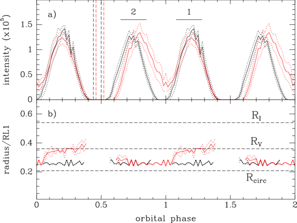 (a) Dependency on orbital phase of the maximum intensity derived from the asymmetric component of the V-band (black) and I-band (red) eclipse maps. Intensities are plotted on an arbitrary scale; arms 1 and 2 are labeled, and horizontal tick marks indicate the phases of maxima of the double-wave orbital modulation. Dotted lines show the uncertainties at the 1σ limit. Vertical dashed lines mark the 1σ range of values for the phase of lowest intensity, ﹩{\phi }_{1}({I}_{{\rm{\min }}})﹩ (see text). (b) Corresponding radius of maximum intensity in units of RL1. Horizontal dashed lines mark the circularization radius (Rcirc = 0.208 RL1) and the outer disk radius (RV = 0.36 RL1 in the V band and RI = 0.54 RL1 in the I band).
