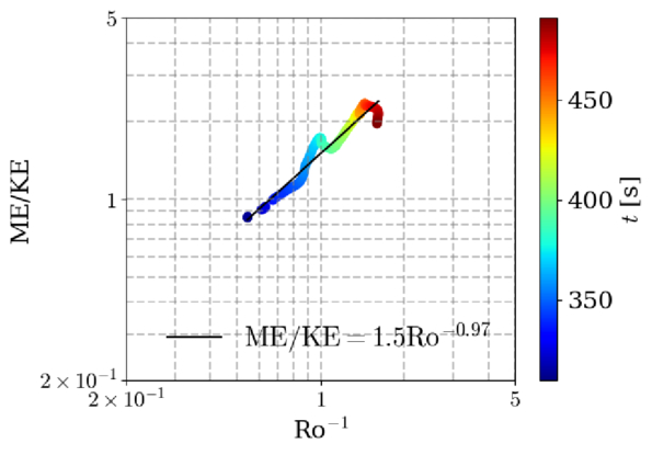 The horizontal axis shows the inverse of the Rossby number, and the vertical axis shows the ratio between the magnetic and kinetic energy. The color of each point indicates the corresponding time in the simulation that satisfies the quasi-steady state condition, as shown by the rainbow colorbar (t = 300–480 s; Equation (10)). The black solid line represents the best fit to the quantities taken from the 3D MHD simulation.