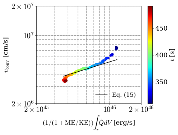 Comparison of our predicted convective energy flux based on the energy partition between convective and Poynting fluxes (Equation (15)) with simulation data. The convective velocity vconv in the O shell is shown on the vertical axis against the right-hand side of Equation (15) on a log-log scale. The color of each point indicates the corresponding time in the simulation during the quasi-steady-state phase (t = 300–480 s). The black line represents a power law with an index of 1/3.