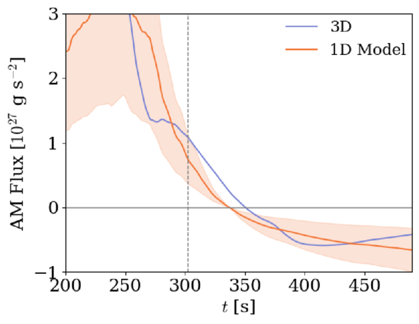 The temporal evolution of the angular momentum flux due to the Maxwell stress (Equation (3)) in the 3D MHD simulation (blue line). Our 1D model, given by Equation (20) is shown by the orange line. The orange shaded region represents the uncertainty of the 1D model, accounting for the combined standard deviation of the model parameters. The flux is measured at the middle of the O shell (4500 km). The gray dashed line indicates the time at which the convective dynamo in the O shell reaches the quasi-steady state. After 340 s and 350 s for the 1D and 3D models, respectively, the angular momentum is transported inward, coinciding with the timing when the rotation rate begins to spin up (see Figure 1(a)).