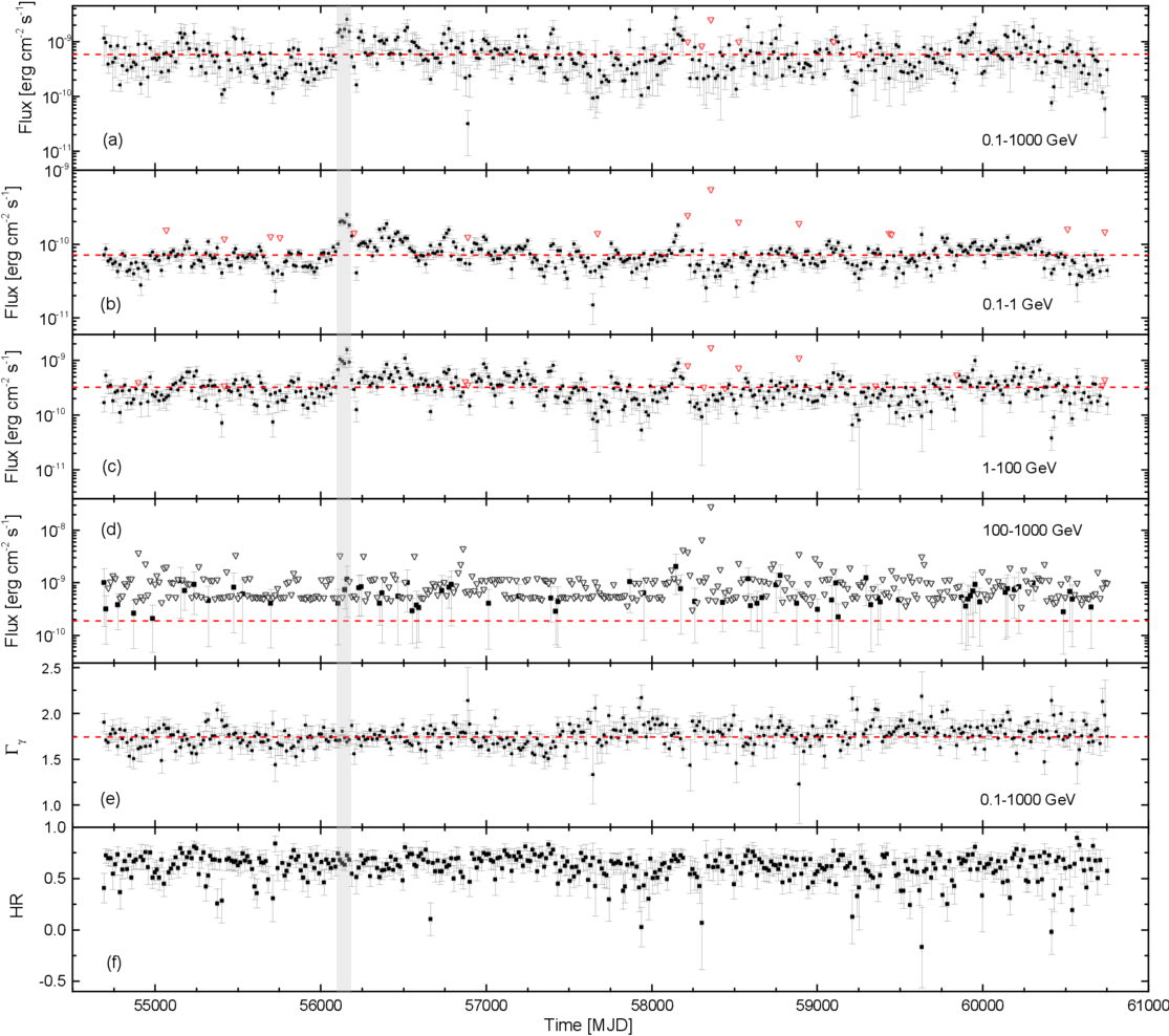 The 17 yr long-term light curves, derived with a 14 day time bin, in the 0.1–1000 GeV band (panel (a)), 0.1–1 GeV band (panel (b)), 1–100 GeV band (panel (c)), and 100–1000 GeV band (panel (d)), as well as the curves of Γγ (panel (e)) and HR (panel (f)). The red horizontal dashed lines represent the average values. If TS < 9, an upper limit of flux (red or black open triangles) is provided for that time bin. The gray shaded area indicates the time interval during which the light curve on a daily timescale is derived, as depicted in Figure 3.
