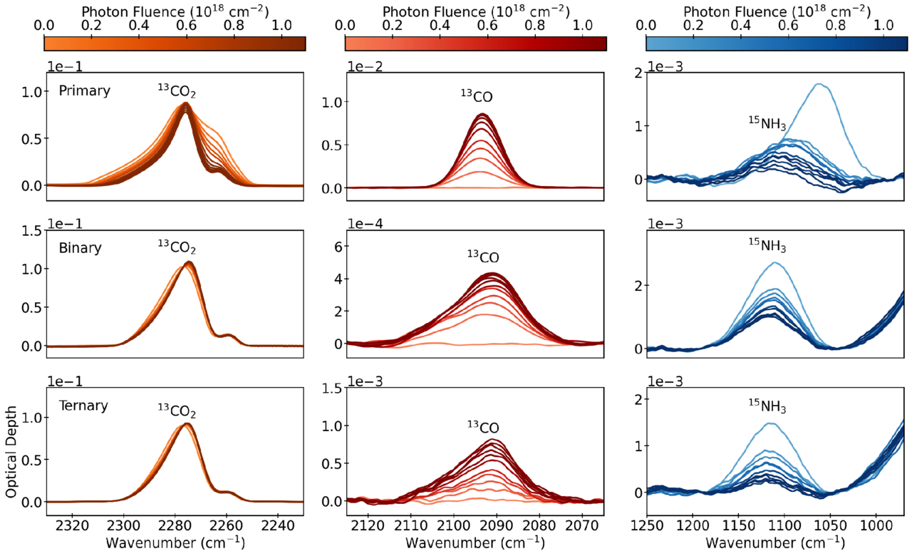 The infrared spectra of various ices throughout UV photolysis at 10 K. Left: CO2. Middle: CO. Right: NH3. Top row: pure ices. Middle row: water-rich binary ices. Bottom row: water-rich ternary ices.