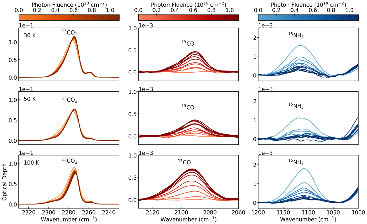 The infrared spectral bands of CO2 (left), CO (middle), and NH3 (right) during photolysis of ternary ices at 30 (top), 50 (middle), and 100 K (bottom). The baselines used here are the same as those described in Section 2.3.